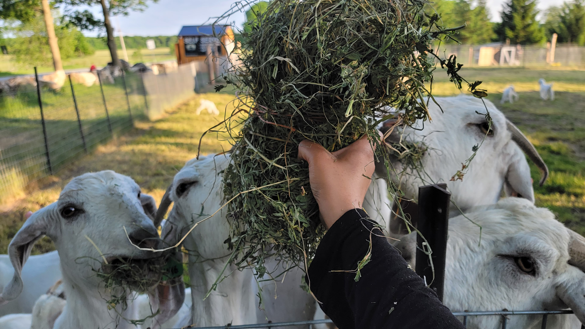 All visitors (kids & adults) can have an amazing and unique experience feeding mamma goats. Simply buy one or more hay bundles from the shed and take it close to the fence line on the north side. Goats will see you with the hay and come running to feed and entertain you